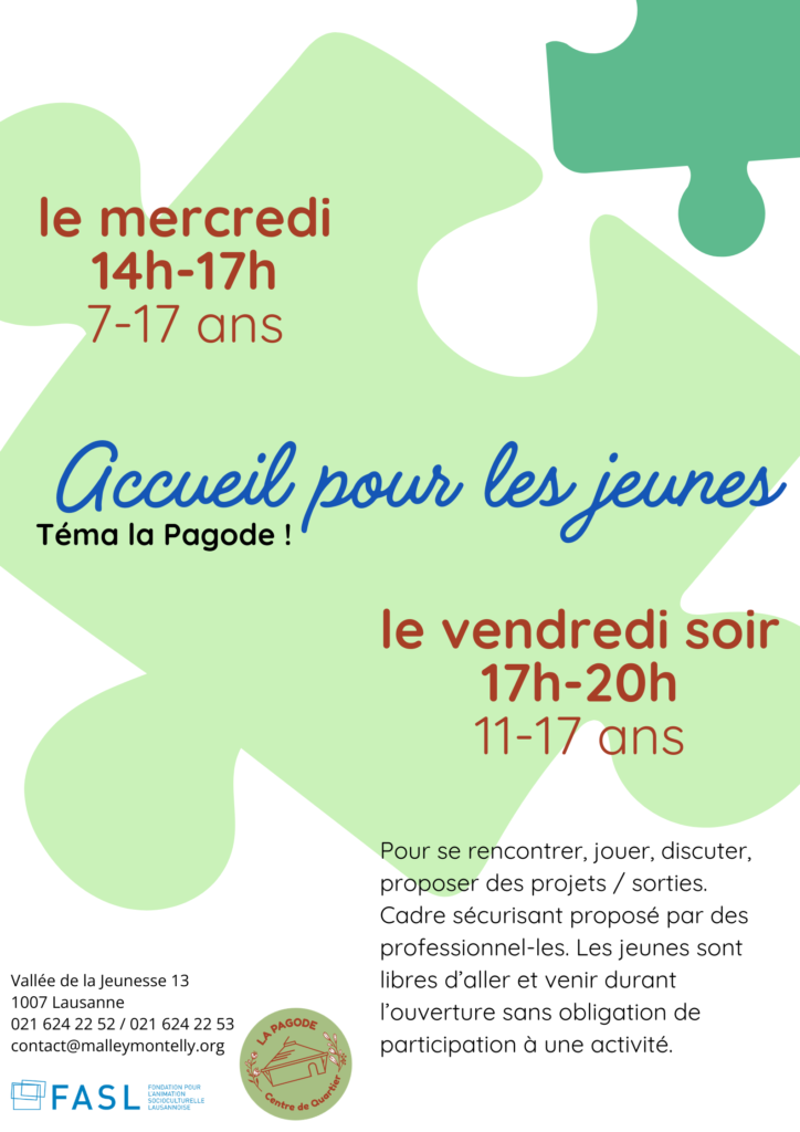 Téma La Pagode les mercredis de 14h à 17h, accueils libres pour les jeunes de 7 à 17 ans. Jeux de société, bibliothèque, jeux d’extérieur, ateliers créatifs, discussions et petites activités